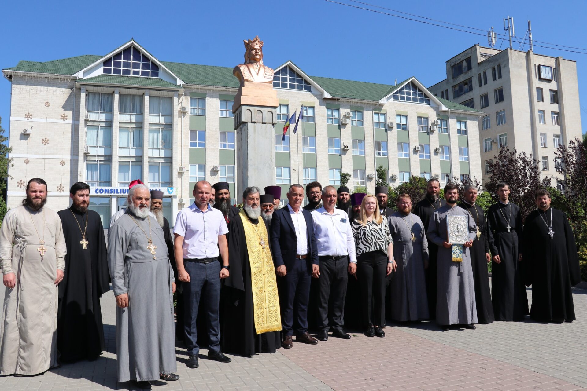 După încheierea slujbei, soborul de preoți, conducerea raionului și credincioșii au mers în procesiune de la catedrala episcopală până la bustul Sfântului Voievod Ștefan cel Mare din fața Consiliului raional.